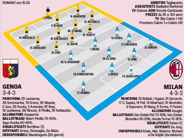 Nel Genoa mister Gian Piero Gasperini in difesa dovrà fare a meno dello squalificato Nicolas Burdisso, che sarà sostituito da Sebastian De Maio. Mentre Giovanni Marchese dovrebbe prendere il posto di Armando Izzo. A centrocampo le novità possono essere l’impiego di Edenilson a destra e di Stefano Sturaro al centro. Davanti Alessandro Matri dovrebbe vincere il ballottaggio con Mauricio Pinilla.