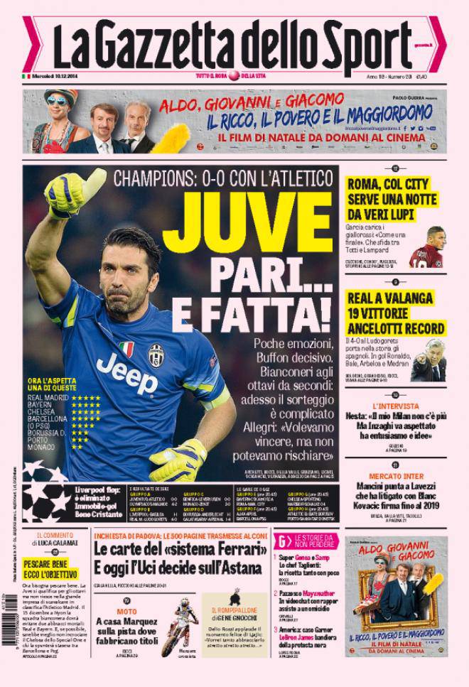 Gazzetta dello Sport, la prima pagina del 10 dicembre