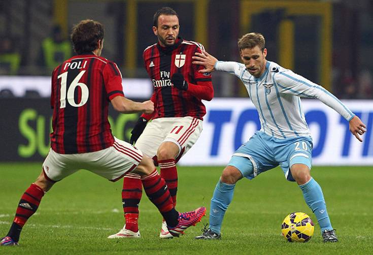 Si sono conclusi i primi 45 minuti della sfida di Coppa Italia tra Milan e Lazio a San Siro. Rossoneri sotto di un gol a causa del gol su rigore di Biglia, ma sopra di un uomo: espulso nel finale di tempo il difensore Cana per doppio fallo da dietro prima su Pazzini, poi su Cerci.