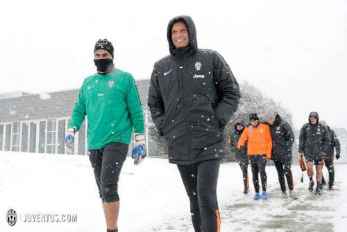 Si avvicina la sfida di campionato tra Juventus e Milan, sabato sera alle 20.45 allo Juventus Stadium. I giocatori bianconeri durante l’allenamento di oggi hanno dovuto fare i conti con un’abbondante nevicata che ha ricoperto il centro Sportivo di Vinovo. Mister Allegri, per l’occasione ha fatto svolgere una seduta prevalentemente tattica, per provare i movimenti e i meccanismi per la partita contro gli uomini di mister Inzaghi.
