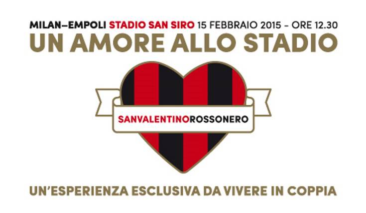 Per la partita di Serie A Milan-Empoli in programma il prossimo 15 febbraio alle ore 12,30 a San Siro il Milan propone in vendita il PACCHETTO SAN VALENTINO ROSSONERO allo speciale prezzo di € 135 a persona. Un’offerta esclusiva per continuare a vivere la festa degli innamorati anche a Casa Milan e allo stadio con un trattamento top class. Il Pacchetto San Valentino Rossonero è proposto inedizione limitata ed è in vendita a Casa Milan e online su acmilan.com da giovedì 5 febbraio fino a venerdì 13 febbraio 2015.