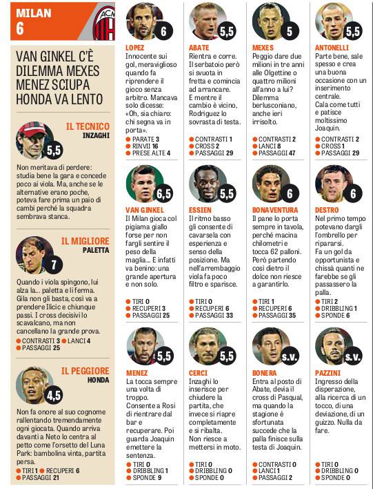 Un’altra sconfitta per un Milan che stavolta avrebbe meritato almeno un punticino nella trasferta di Firenze, che vede i rossoneri combattere e andare persino in vantaggio per poi subire l’ennesimo blackout stagionale. Ecco come la Gazzetta dello Sport di oggi ha valutato la prestazione dei calciatori milanisti scesi ieri in campo al ‘Franchi’ sotto una pioggia incessante che testimoniava benissimo il momento no della squadra di Inzaghi.