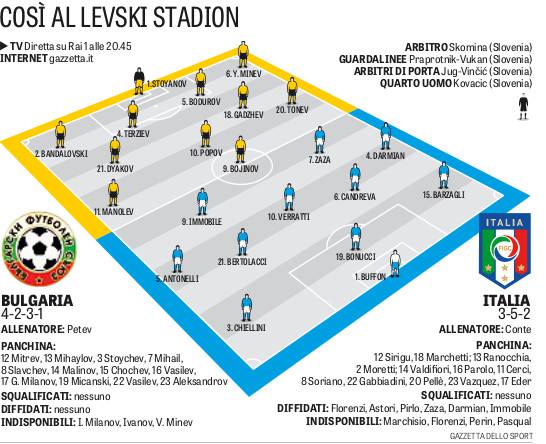Falcidiata dalle assenze, con un undici nuovo e sorprendente. Ma Antonio Conte vuole i tre punti e guiderà stasera la sua Italia sul terreno sempre molto insidioso di Sofia, tana della Bulgaria di Petev. Il match serale valido per le qualificazioni ad Euro 2016 è un crocevia importante per gli azzurri, primi nel girone H con 10 punti a pari merito con la Croazia e insidiati alle spalle dalla Norvegia a 9 punti.