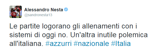 Lo storico difensore del Milan della nazionale italiana Alessandro Nesta, tramite il proprio account Twitter, ha detto la sua su tale situazione: “Le partite logorano, gli allenamenti con i sistemi di oggi no. Un’altra inutile polemica all’italiana”.