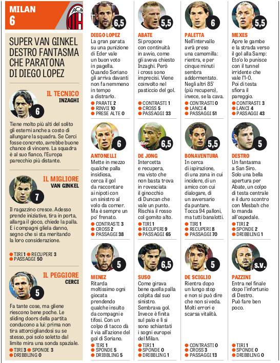 Milan grintoso ma impreciso, che forse pecca soprattutto per la giornata storta dei suoi uomini migliori. La pensa così la Gazzetta dello Sport, che assegna pagelle e giudizi dopo il pareggio contro la Sampdoria premiando l’impegno dei meno attesi, ma più brillanti in mezzo al campo. Marco van Ginkel su tutti è stato giudicato continuo e al centro dell’azione, in crescita rispetto al passato. Male, malissimo il tridente Cerci-Destro-Menez, impalpabili e dunque bocciati.