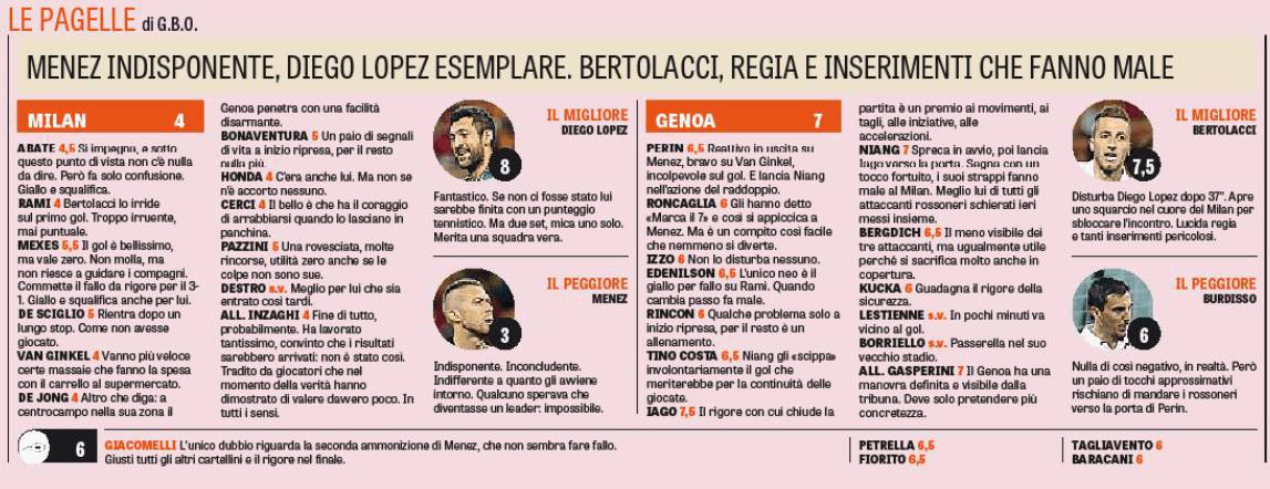 Ieri sera Milan protagonista di una pessima partita contro il Genoa a San Siro e l’1-3 finale a favore dei rossoblu è la naturale conseguenza di quanto si è visto in campo. L’unico a salvarsi nella squadra di Filippo Inzaghi è Diego Lopez, portiere in grado di evitare un passivo ben peggiore ai rossoneri. Malissimo Jeremy Menez, spesso indicato come leader del gruppo, anche se le bocciature gravi sono davvero tante. Ecco di seguito le pagelle redatte da La Gazzetta dello Sport. Molti saranno d’accordo con queste valutazioni negative.