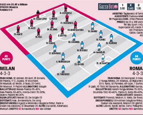 Il tecnico piacentino si affiderà alla verve dell’ex di turno Mattia Destro, che potrebbe sentire particolarmente la sfida contro i giallorossi, proprietari del suo cartellino. Tre rientri importanti rispetto a Napoli: gli squalificati Ignazio Abate e Philippe Mexes riprenderanno i rispettivi posti in difesa, così come Luca Antonelli che ha superato il fastidio all’inguine. Per il resto confermato il Milan di domenica scorsa.