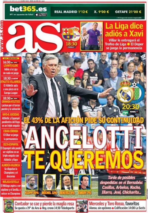 I tifosi però nonostante le cocenti delusioni di questa stagione da ‘zero titoli’, vorrebbero ancora Ancelotti al timone della squadra. Addirittura, secondo un sondaggio di As.com che ha visto partecipare circa 22 mila persone, il 43% preferirebbe che le cose rimanessero così come stanno. Nel caso però Ancelotti dovesse lasciare, il primo nome in cima alla lista della dirigenza sarebbe Rafa Benitez. I tifosi però preferirebbero Jurgen Klopp, che ha ricevuto il 30% delle preferenze, mentre l’attuale tecnico del Napoli è stato preferito da appena l’8% dei votanti, addirittura dietro lo spagnolo Michel (12%) ex giocatore blancos e ex allenatore delle giovanili. Di seguito ecco la prima pagina di As che titola appunto: “Ancelotti te queremos”, ovvero “Ancelotti ti vogliamo“.