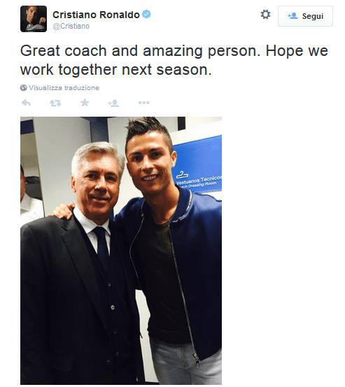 A Madrid l’addio di Carlo Ancelotti viene dato per certo ormai da tempo, il presidente Florentino Perez infatti ha deciso di sostituire l’allenatore in grado di conquistare al primo tentativo la Champions League (la famosa Decima). Ma nel Real c’è chi vorrebbe che il tecnico di Reggiolo rimanesse. Tanti tifosi e anche diversi giocatori. Tra questi ultimi c’è Cristiano Ronaldo, che con lui ha instaurato un ottimo rapporto e sul proprio profilo Twitter ha pubblicato una foto che li ritrae insieme ed il seguente messaggio: “Grande allenatore e persona meravigliosa, sperando di lavorare ancora assieme nella prossima stagione“. Uno dei leader dello spogliatoio dei blancos di è schierato apertamente con l’attuale allenatore auspicando una sua permanenza, ma il suo proclamo rimarrà inascoltato visto che Perez pare aver ormai preso la sua decisione.