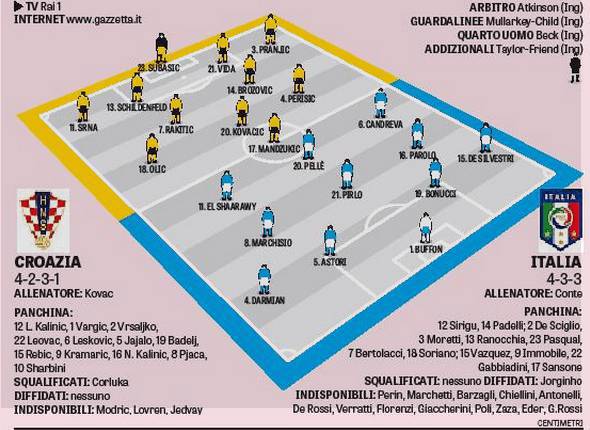 Il ct azzurro Conte dovrà fare a meno di alcuni leader della sua rosa, a cominciare dagli infortunati Chiellini, De Rossi, Barzagli e Verratti. Dalla difesa a tre, un classico della sua gestione in Nazionale, si passerà ad un 4-3-3 più lineare. Uomo decisivo potrà essere Stephan El Shaarawy, il Faraone rossonero che torna ad indossare l’azzurro dopo circa otto mesi; e lo farà da titolare, come attaccante esterno sinistro, ruolo che conosce alla perfezione. Solo panchina per l’altro rossonero Mattia De Sciglio, che dovrebbe partire svantaggiato nel duello con De Silvestri per la fascia destra di difesa.