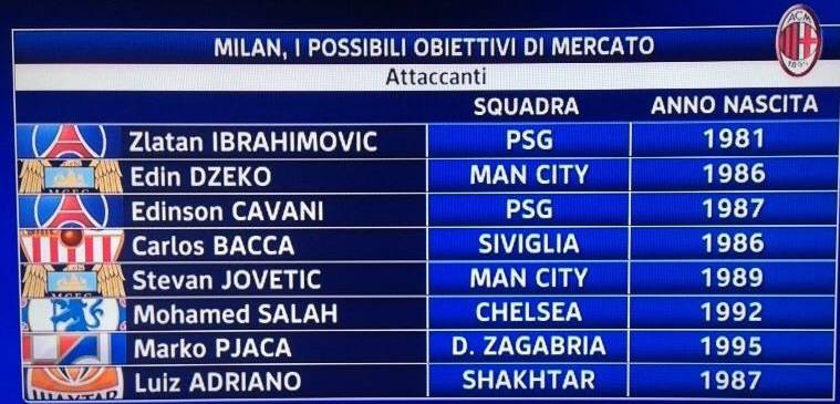 A questo punto quali potrebbero essere le alternative al colombiano? La redazione di Sky Sport 24 ha stilato una grafica (foto in basso) con i possibili attaccanti che potrebbero essere esaminati in via Aldo Rossi nei prossimi giorni: “Ibrahimovic? Possibilità che torni del 10%, ma non è facile dare queste percentuali”.