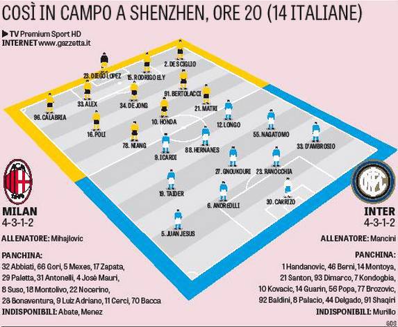 Bagno di folla per il Milan, arrivato nelle scorse ore a Shenzhen, ma nella stracittadina amichevole ci sarà spazio soprattutto per molte seconde linee e per esperimenti, sia da una parte che dall’altra. I rossoneri sono ancora privi del duo d’attacco Bacca-Luiz Adriano e punteranno sui rientranti M’Baye Niang e Alessandro Matri, con Alessio Cerci come prima alternativa. Nel 4-3-1-2 di mister Mihajlovic ci sarà spazio per il giapponese Keisuke Honda, nel ruolo da lui tanto amato di trequartista centrale.