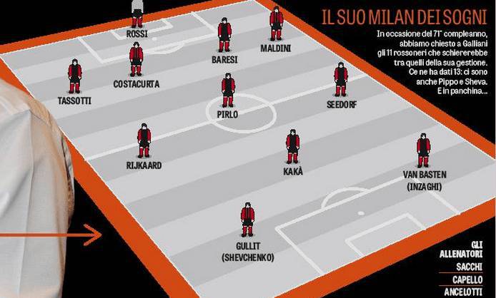 Ne è venuta fuori una super-formazione, con Galliani che si è azzardato soltanto ad inserire due ‘parentesi’ in attacco: “Mi dia foglio e penna. Premessa: scelgo in base a quello che i giocatori hanno dato al Milan. Parto dalla difesa che è indiscutibile: Tassotti, Costacurta, Baresi, Maldini. In porta Rossi, perché è suo il record di imbattibilità. Passo in attacco: Kakà trequartista e poi la coppia Gullit-Van Basten. Però mi concedo due parentesi proprio tra le punte e cito Shevchenko e Inzaghi. Regista sicuramente Pirlo, interni Rijkaard e Seedorf. Allenatori Sacchi, Capello, Ancelotti”.