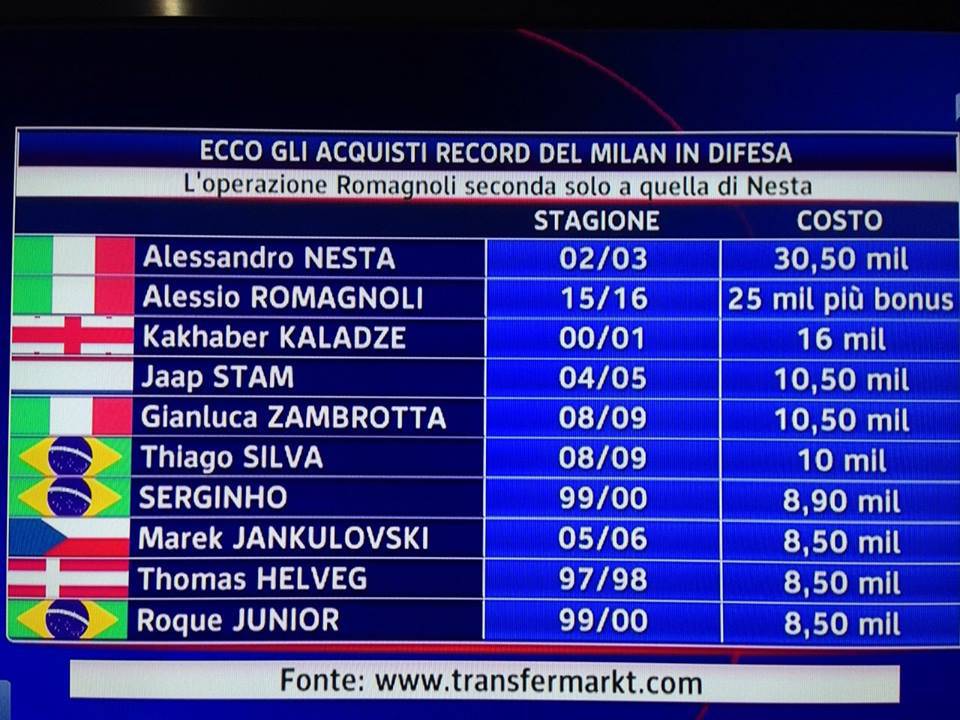Romagnoli sarà l’acquisto più caro in difesa della storia del Milan, secondo solo a Sandro Nesta che nel lontano 2002 venne pagato 30,5 milioni di euro alla Lazio. Di seguito la foto pubblicata dai colleghi di Sky Sport in merito agli ultimi acquisti in difesa: