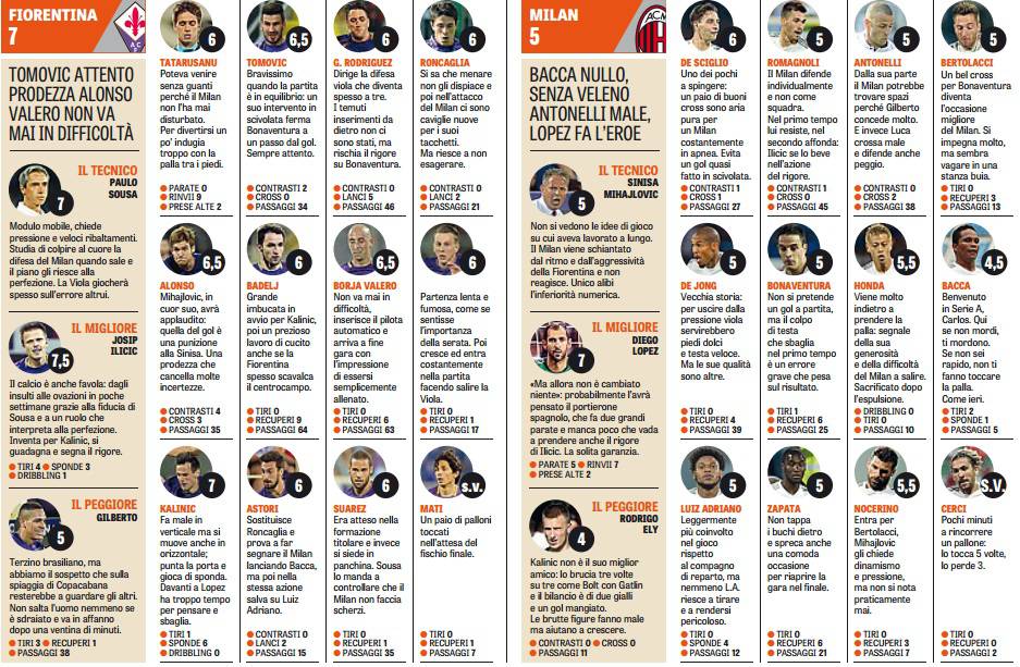 Il Milan perde malamente per 2-0 contro la Fiorentina al Franchi ed è difficile trovare qualcuno che si salvi nella squadra rossonera dal punto di vista della prestazione. Sicuramente Diego Lopez è stato il migliore con i suoi interventi, a volte prodigiosi. Fioccano le bocciature. Il peggiore Rodrigo Ely per aver lasciato i compagni in inferiorità numerica dopo poco più di mezzora di partita. Ma anche Carlos Bacca e gli altri hanno deluso molto. Anche Sinisa Mihajlovic si becca un 5, i suoi ragazzi non giocano un bel calcio e non hanno neppure la grinta di cui tanto aveva parlato.