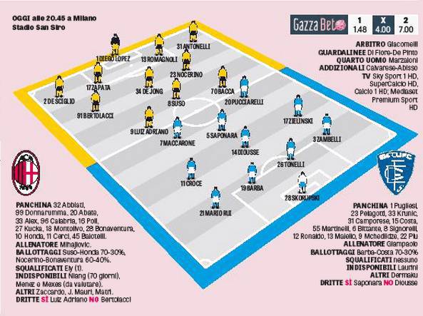 La Gazzetta dello Sport ricorda quest’oggi come in casa rossonera sarà assente Rodrigo Ely, fermato per un turno di squalifica, mentre i due nuovi arrivati Mario Balotelli e Juraj Kucka non potranno far altro che sedersi in panchina, avendo sulle gambe pochissimi allenamenti con la compagine rossonera. Mihajlovic potrebbe optare per dei cambiamenti: Cristian Zapata in difesa accanto ad Alessio Romagnoli è scelta scontata, meno quelle che potrebbero vedere Antonio Nocerino e Suso titolari a sorpresa, rispettivamente al posto dei deludenti Bonaventura e Honda.