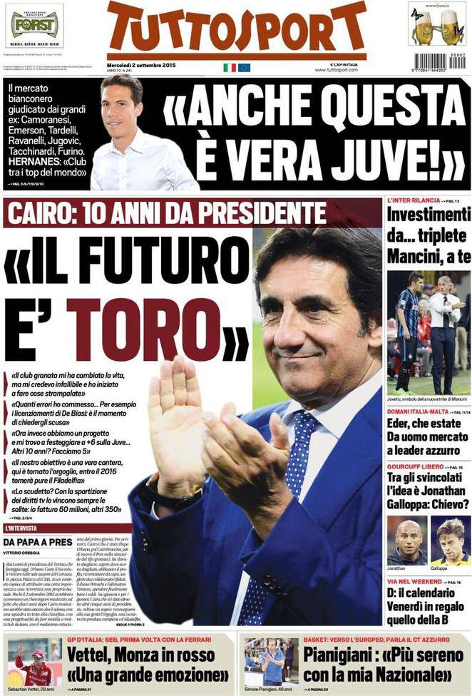 Tuttosport, la prima pagina del 2 settembre