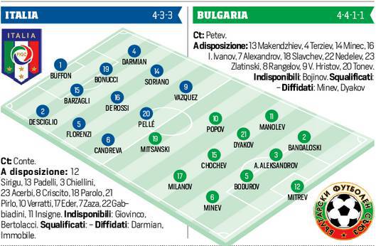 Antonio Conte, secondo il Corriere dello Sport, è pronto a variare di molto la formazione vista contro Malta giovedì scorso; va fuori il rossonero Andrea Bertolacci, infortunatosi all’adduttore, mentre come detto giocherà De Sciglio. Cambi anche in attacco dove Candreva e Vazquez dovrebbero essere preferiti a Gabbiadini ed Eder.