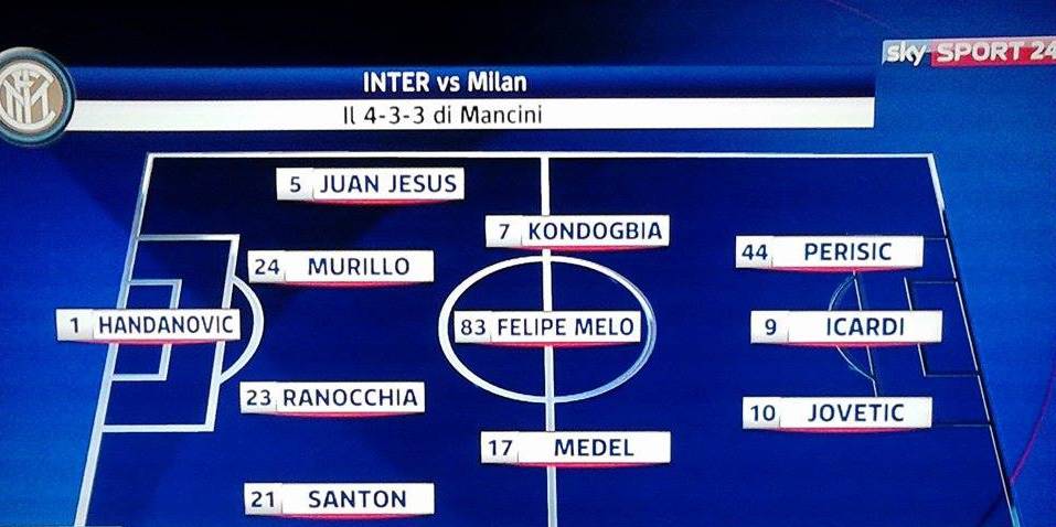 Roberto Mancini dovrà fare i conti con l’infortunio di Miranda e al suo posto dovrebbe giocare Andrea Ranocchia. A completare il reparto dovrebbe essere l’altro centrale Murillo e sulle fasce Juan Jesus e Santon. Andrà in panchina il terzino acquistato nell’ultimo giorno di mercato dal Galatasaray Alex Telles. A centrocampo invece partirà dal primo minuto l’altro acquisto dell’ultim’ora: Felipe Melo, che con Kondogbia e Medel completeranno il centrocampo a 3 tutto muscoli. In attacco invece tridente con Jovetic, Icardi e Perisic.