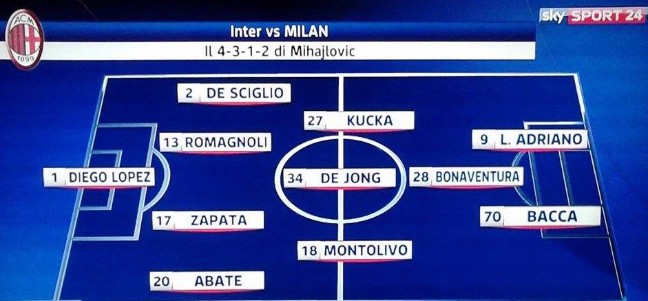 Milan (4-3-1-2): Diego Lopez; Abate, Zapata, Romagnoli, De Sciglio; Montolivo (Poli), De Jong, Kucka; Bonaventura; Bacca, Luiz Adriano. All. Sinisa Mihajlovic.