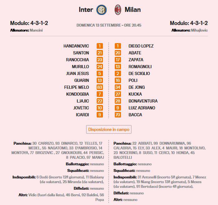 Il countdown di Inter–Milan segna -2 giorni al primo derby ufficiale della stagione. In queste ore, i due tecnici Roberto Mancini e Sinisa Mihajlovic stanno ancora lavorando per limare gli ultimi dettagli in vista di questa importantissima sfida e, valutando le condizioni dei propri giocatori e dei nazionali rientrati dai rispettivi impegni in giro per il mondo, stanno preparando il proprio undici titolare da schierare in campo domenica sera.