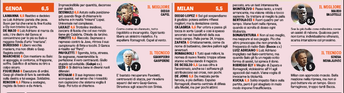Come ogni mattinata post-partita, la Gazzetta dello Sport ha pubblicato voti e pagelle del Milan; in questo caso giudizi incolore dopo la sconfitta di misura subita sul campo del Genoa, per via di un gol fortunoso di Dzemaili e di una prova globale scarsamente sufficiente fornita dalla squadra ospite. Secondo la ‘rosea’ il maggior colpevole è proprio Sinisa Mihajlovic, il tecnico che con le scelte poco lucide non è riuscito a mettere in campo una formazione adeguata e combattiva.