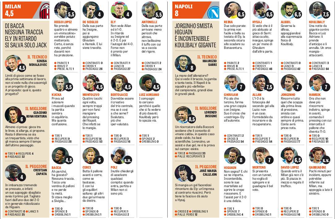 La Gazzetta dello Sport è intransigente e durissima con voti e pagelle dei rossoneri scesi in campo ieri sera; unico a salvarsi per la ‘rosea’ è Jack Bonaventura, premiato con la sufficienza per l’impegno e la volontà trasmessi per tutti i 90′, pur schierato in un ruolo non propriamente classico per le sue qualità. Bocciatura totale per il resto della squadra, dai due centrali Zapata e Rodrigo Ely completamente nel pallone, fino al tandem d’attacco Bacca-Luiz Adriano che hanno toccato la sfera davvero pochissime volte.