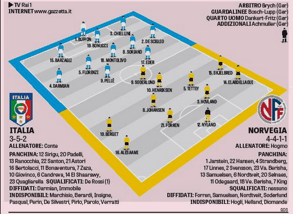 Un match, quello di stasera allo stadio Olimpico di Roma, che vale molto per il ct Antonio Conte, visto che c’è in ballo il primato del girone e soprattutto questioni legate al ranking Uefa: con una vittoria la squadra azzurra dovrebbe ottenere un posto come testa di serie ai prossimi sorteggi di Euro 2016, senza essere superata dal Belgio. Intanto Conte pensa di tornare al 3-5-2 secondo la Gazzetta dello Sport, rispolverando il milanista Riccardo Montolivo come regista titolare, al posto dell’ottimo Marco Verratti, tra i migliori in Azerbaigian. In campo dovrebbe andare anche Mattia De Sciglio, schierato stavolta come esterno di centrocampo a sinistra.