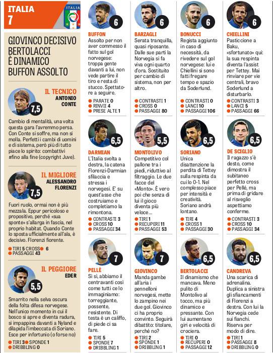 La Gazzetta dello Sport ha pubblicato le pagelle degli azzurri scesi in campo ieri nella capitale; ben tre i milanisti schierati dal ct Conte: titolare a sinistra Mattia De Sciglio, propositivo e molto attivo anche in fase offensiva. Meno brillante la prova di Riccardo Montolivo, di nuovo titolare con l’Italia dopo quasi 500 giorni ma ancora in fase di rodaggio come regista centrale. Lo stesso capitano del Milan ha lasciato il posto a Andrea Bertolacci nella ripresa, abile a giostrare davanti alla difesa nel passaggio dal 3-5-2 al più concreto 4-4-2.
