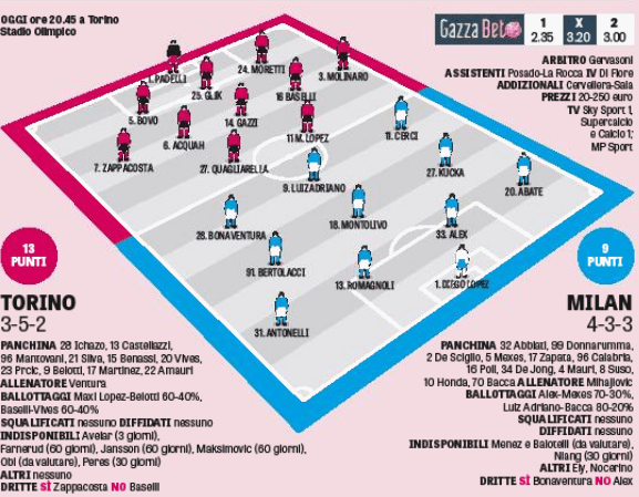 Ecco la grafica de La Gazzetta dello Sport con le probabili formazioni di Torino-Milan.