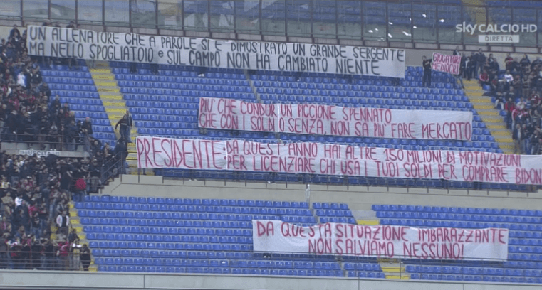 La Curva Sud Milano, noto gruppo organizzato del tifo milanista, nel pre-partita di Milan-Sassuolo ha esposto degli striscioni molto eloquenti per manifestare il proprio dissenso per la situazione che sta attraversando la squadra rossonera. La tifoseria ce l’ha con tutti: società, giocatori e allenatore. Non a caso compare la scritta: “Da questa situazione imbarazzante non salviamo nessuno!“.