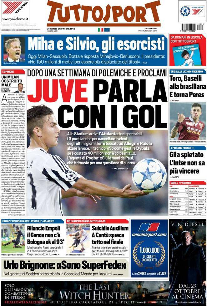 Tuttosport, la prima pagina del 25 ottobre