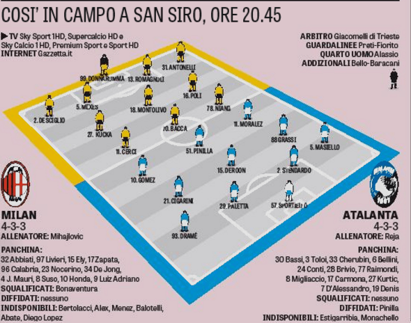 La Gazzetta dello Sport conferma ovviamente il 4-3-3 con cui Montolivo e compagni hanno fatto benissimo nelle ultime settimane, dalla gara contro il Torino in poi. Il modulo ‘imbattuto’ sarà sorretto ancora proprio dal capitano rossonero, recuperato dopo il guaio muscolare accusato contro la Lazio e presumibilmente titolare in cabina di regia. In difesa spazio a Philippe Mexes vicino al giovane Romagnoli, mentre varia l’attacco: Niang in vantaggio su Honda per il ruolo di ala sinistra d’attacco al posto di un certo Bonaventura, che lascia un’eredità pesante su quella fascia.