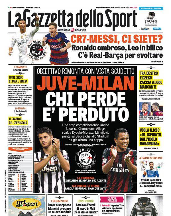 Gazzetta dello Sport, la prima pagina del 21 novembre