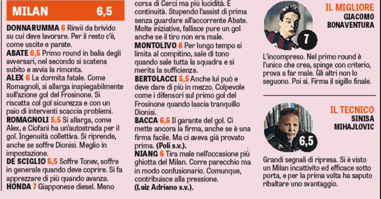 Il Milan ‘double face’ vince e convince, anche se non mancano le sofferenze contro un buon Frosinone, soprattutto nel primo tempo. Secondo la Gazzetta dello Sport è grazie ai singoli e alle prove individuali che Sinisa Mihajlovic è riuscito ad ottenere una vittoria salva-panchina almeno per il momento. Il tecnico serbo deve ringraziare gli exploit di Jack Bonaventura e compagni, i soliti noti più qualche sorpresa nella serata del ‘Matusa’.