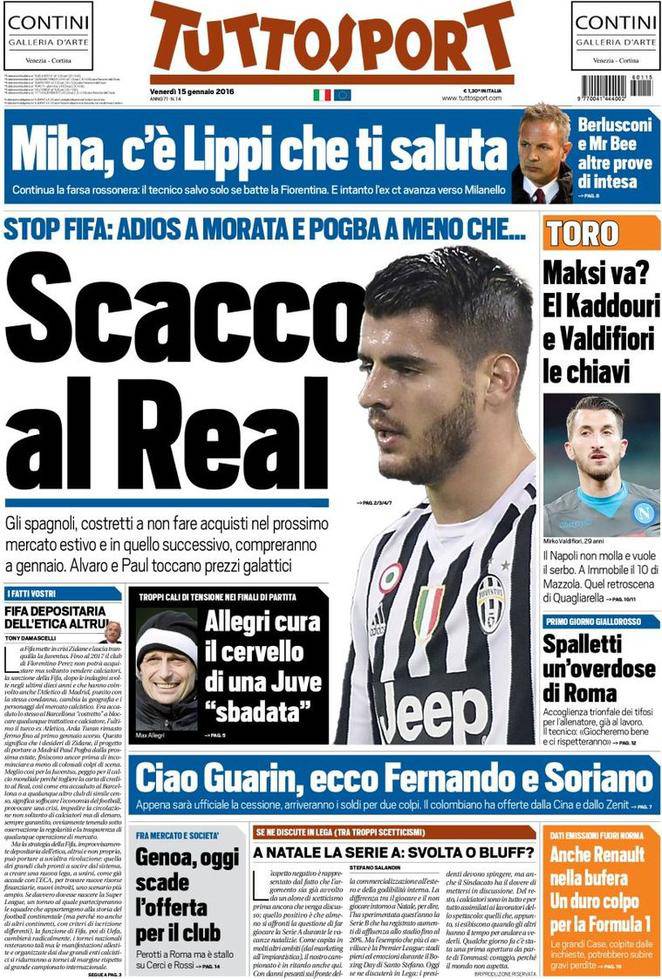 Tuttosport, la prima pagina del 15 gennaio 2016