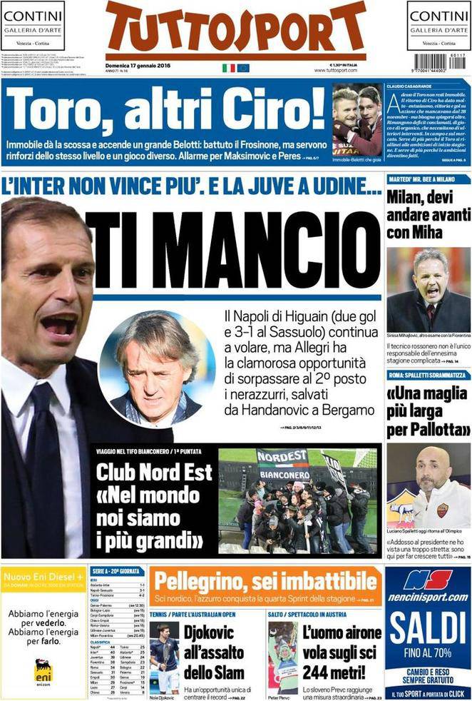 Tuttosport, la prima pagina del 17 gennaio 2016