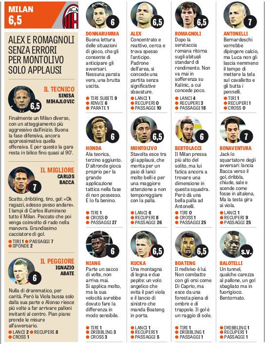 Tanti dunque i promossi nelle pagelle odierne, su tutti Carlos Bacca considerato il migliore in campo, autore di uno straordinario gol che ha messo in mostra tutte le sue migliori qualità: scatto, velocità, tecnica di base e cinismo sotto porta. Bene come al solito Giacomo Bonaventura, che ha stravinto il duello sulla fascia con il temibile Bernardeschi, mentre si è rivisto un Riccardo Montolivo finalmente in vena positiva, uscito persino tra gli applausi.