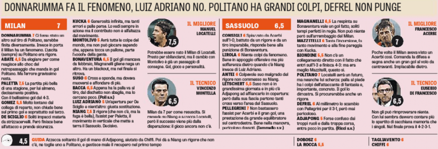 Nel Sassuolo spiccano senza dubbio Francesco Acerbi, Lorenzo Pellegrini e Matteo Politano. Un bel 7 per questi tre giocatori, tutti in gol ieri contro il Milan. Sotto la sufficienza solo Claud Adjapong (5), Timo Letschert (5.5) e Mattia Biondini (5.5).