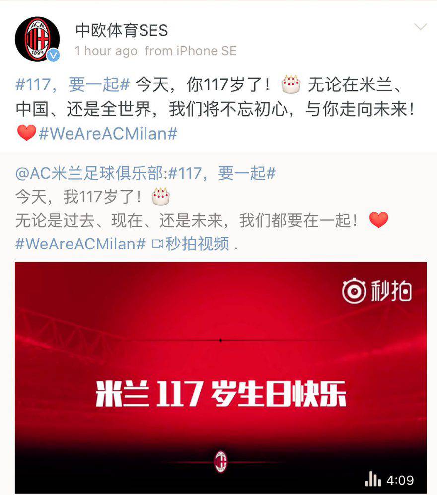 E sono arrivati pure gli auguri della Sino-Europe Sports, la società veicolo creata dagli acquirenti cinesi per comprare il Milan. Sul social network cinese Weibo tramite il proprio profilo ufficiale ha pubblicato un video speciale e il seguente messaggio: “Oggi 117 anni! A Milano, in Cina o in qualunque parte del mondo… Con te verso il futuro“.