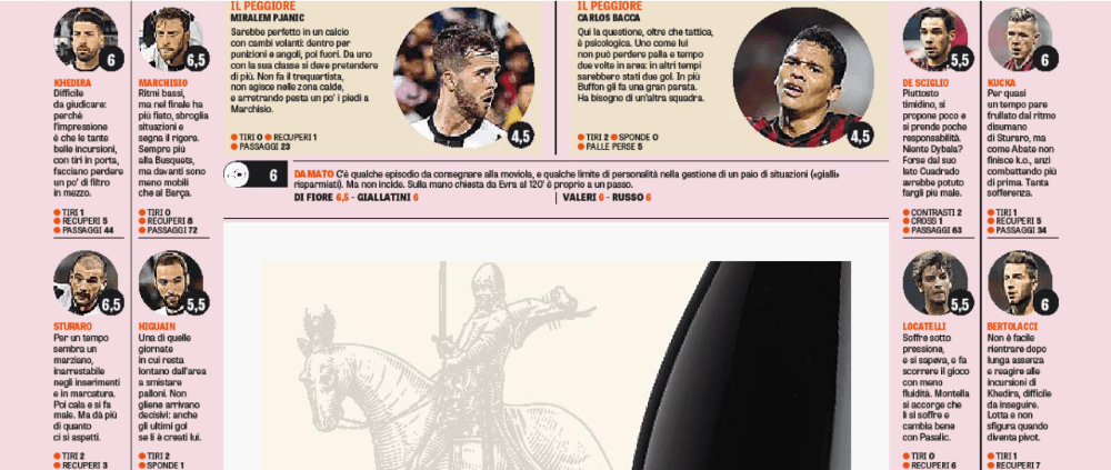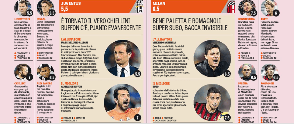 7,5 anche per Gigio Donnarumma, che con tre parate nei minuti regolamentari e il rigore respinto a Paulo Dybala è uno dei protagonisti assoluti della vittoria di ieri; positive le prove dei due centrali Gabriel Paletta e Alessio Romagnoli (6.5 entrambi), capaci di prendere bene le misure a Higuain e compagni.