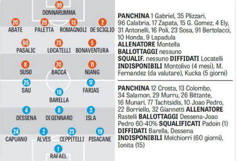 Intanto la Gazzetta dello Sport ha proposto le probabili formazioni del match di oggi a San Siro; il Milan si schiererà presumibilmente con un 4-3-3 più offensivo, ritornando alle origini di inizio stagione. Difesa confermatissima (da segnalare il ritorno di Calabria tra i convocati) ma centrocampo con novità annesse.