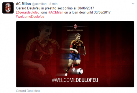 CALCIOMERCATO MILAN – In serata il Milan ha annunciato l’arrivo in prestito secco di Gerard Deulofeu dall’Everton. Il club rossonero ha pubblicato un tweet della notizia, nonostante il giocatore debba ancora sostenere le visite mediche e firmare il contratto.