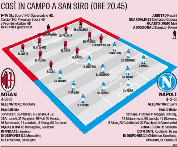 La Gazzetta dello Sport ha pubblicato le probabili formazioni del match di oggi a San Siro; come detto moduli speculari per Milan e Napoli, anche se schierati con caratteristiche ben differenti. I rossoneri devono fare a meno di due squalificati (Romagnoli e Locatelli) e Montella punterà sull’entusiasmo dei sudamericani Gustavo Gomez e José Sosa.