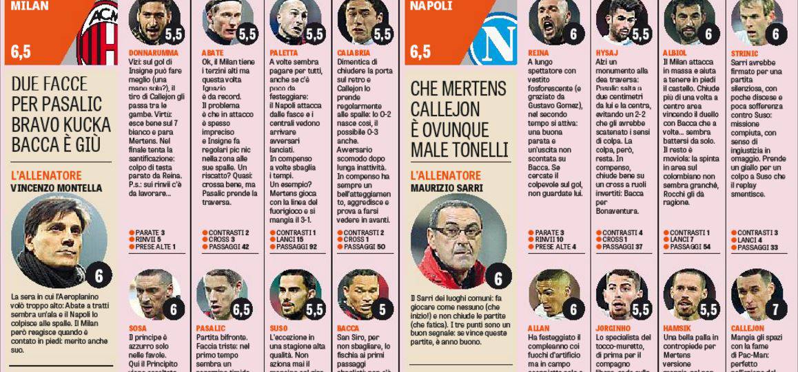 Come di consueto la Gazzetta dello Sport ha pubblicato oggi le pagelle del match di San Siro; non troppe bocciature a livello individuale per i calciatori del Milan. Tra i migliori spiccano Juraj Kucka e Giacomo Bonaventura, entrambi premiati con un bel 7 come voto finale per una prova intensa e ricca di entusiasmo. Lo slovacco, autore del gol della speranza rossonera, è un autentico motorino a centrocampo, Jack invece non è più una sorpresa.