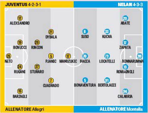 Come di consueto, la Gazzetta dello Sport di oggi ha pubblicato le probabili formazioni del match serale dello Juventus Stadium, con fischio di inizio alle ore 20,45. Vincenzo Montella disrgnerà un Milan ovviamente schierato con il solito 4-3-3 ma con qualche novità di formazione. Su tutte l’esordio stagionale di Cristian Zapata, che verrà preferito a Paletta e Gomez in difesa per affiancare un altro rientrante come Alessio Romagnoli.