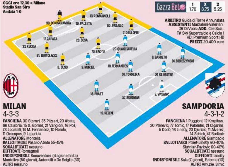 La sfida di oggi nel lunch-match di San Siro potrà essere una svolta per entrambe le compagini; il Milan vincendo ritroverebbe fiducia in zona Europa, anche se il percorso è ancora lungo e tortuoso. La Samp invece potrebbe provare ad avvicinarsi alle posizioni più alte di classifica, o per lo meno continuerebbe la sua crescita costante nel gioco e nei risultati.