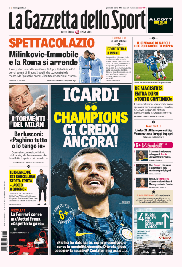 Gazzetta dello Sport: prima pagina del 2 marzo 2017 02/03/2017 - 07:24 di Matteo B. Gazzetta dello Sport