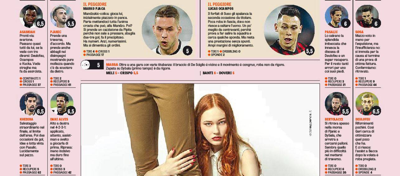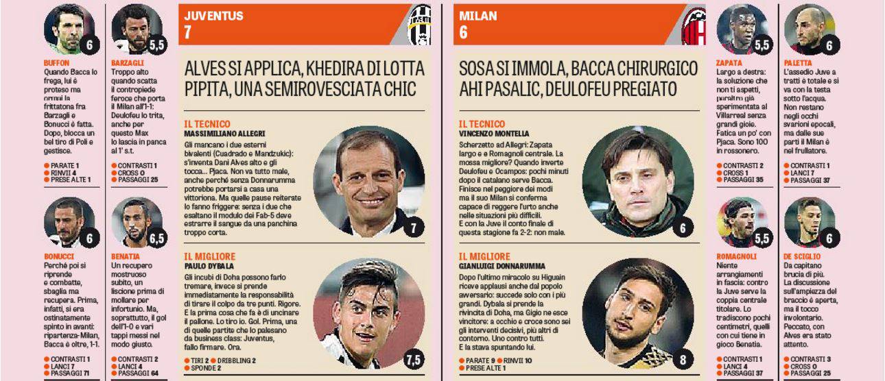 Come di consueto la Gazzetta dello Sport ha pubblicato le pagelle della sfida di ieri allo Stadium; focus particolare sui calciatori del Milan e su Gianluigi Donnarumma, migliore in campo con distacco. Voto 8 al baby portiere che tiene a galla i suoi, battuto solo dal tiro ravvicinato al volo di Benatia e dal rigore di Dybala. La parata finale su Higuain è strepitosa. Tra i più positivi anche Gerard Deulofeu, che serve l’assist vincente e si muove come un furetto, meritandosi almeno il 6,5.