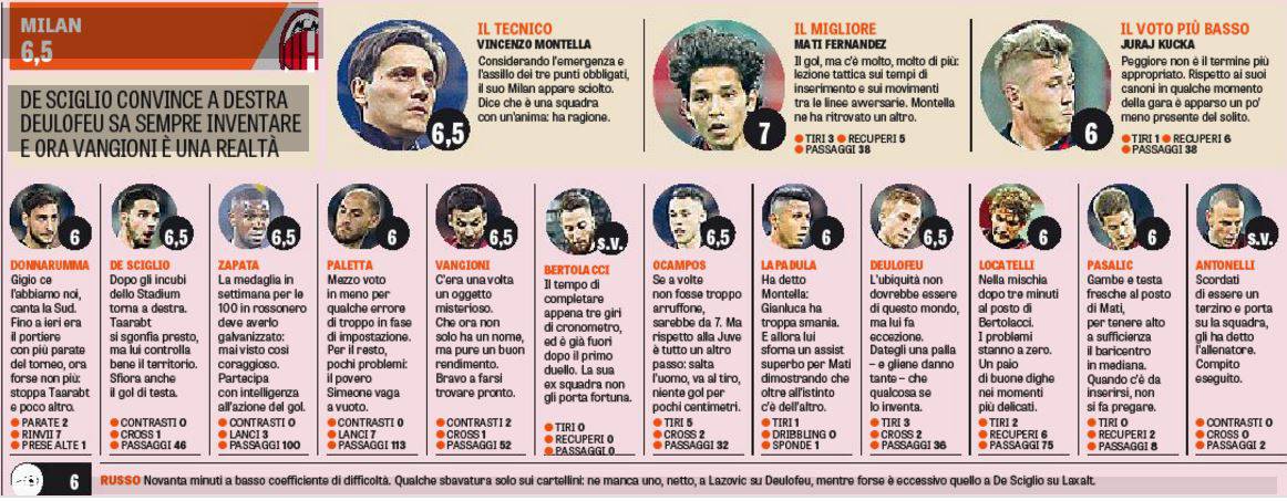 Come di consueto la Gazzetta dello Sport ha pubblicato le pagelle della sfida di ieri; finalmente nessun bocciato in casa Milan, proprio a conferma dell’ottima prestazione collettiva che si rispecchia anche nella prova individuale dei calciatori scesi in campo ieri a San Siro. Su tutti va sottolineato l’impatto di Mati Fernandez, la mossa a sorpresa di Montella che paga con la rete della vittoria ed una prova complessivamente ottima, valutata con un 7 pieno. Molto positivi anche i due esterni d’attacco Gerard Deulofeu e Lucas Ocampos, pericolosi e vivi per tutto l’arco dell’incontro. Per entrambi 6,5 in pagella, così come per un Mattia De Sciglio che comincia ad avere buoni riscontri da terzino destro.